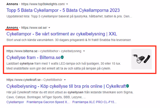 Under annonserna kommer sedan de organiska träffarna som styrs av arbetet med SEO. Du ser tydligt vad som är annonser och vad som är organiska sidor.